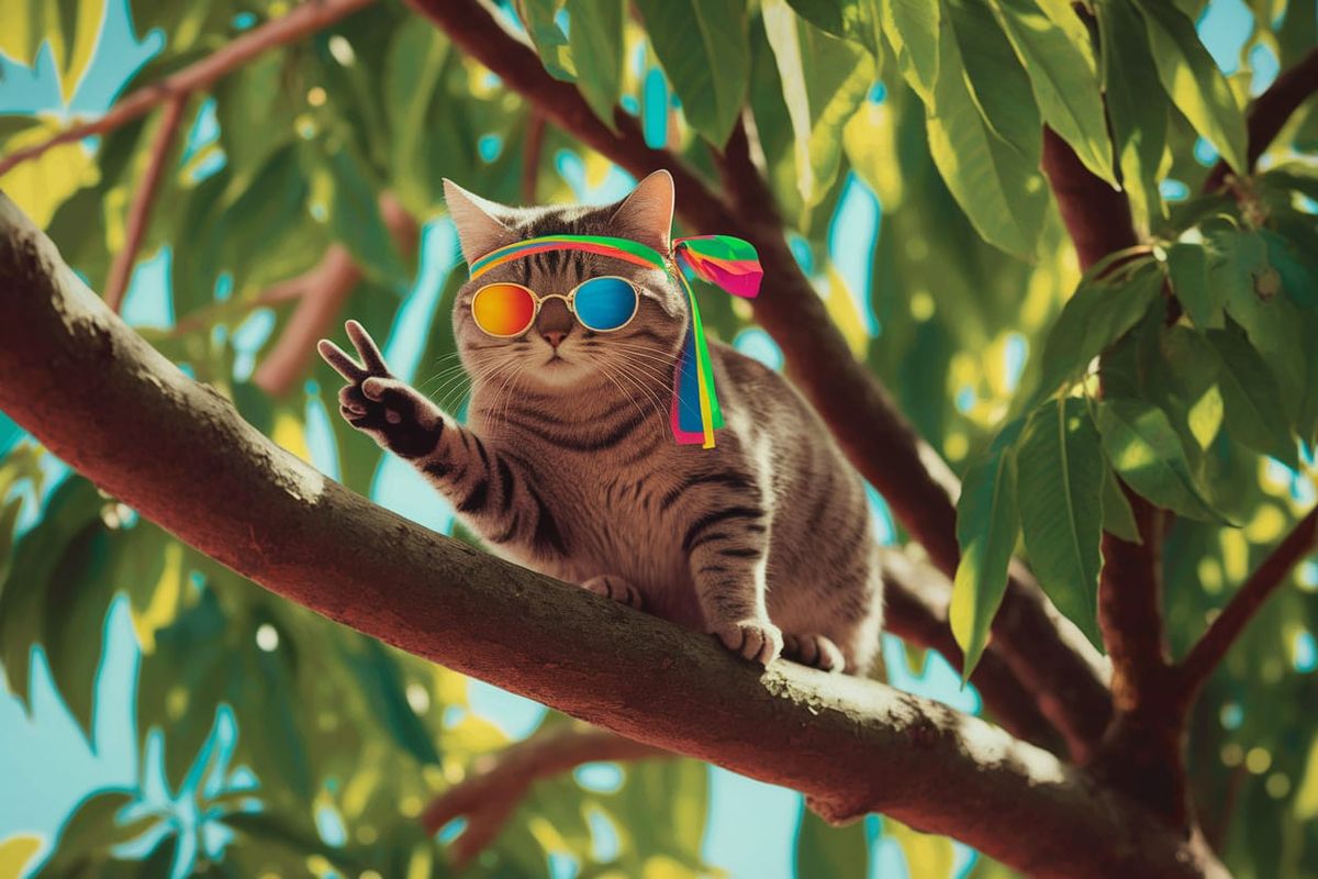 This image features a 1960s-inspired minimalist poster of a groovy cat in a peach tree, rendered in vibrant fluorescent day-glo colors. The cat wears a headband, dashiki, and peace sign sunglasses.
