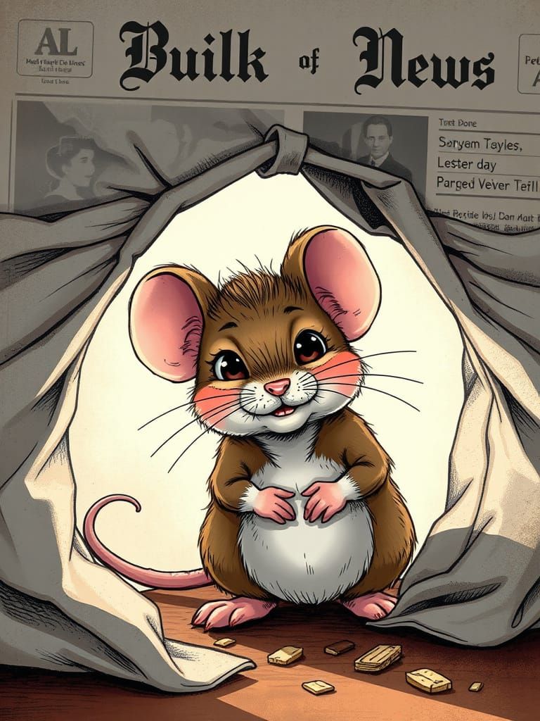 This image shows a cartoon mouse hiding under a newspaper, rendered as smooth, vibrant comic book art. The style evokes modern comic aesthetics.
