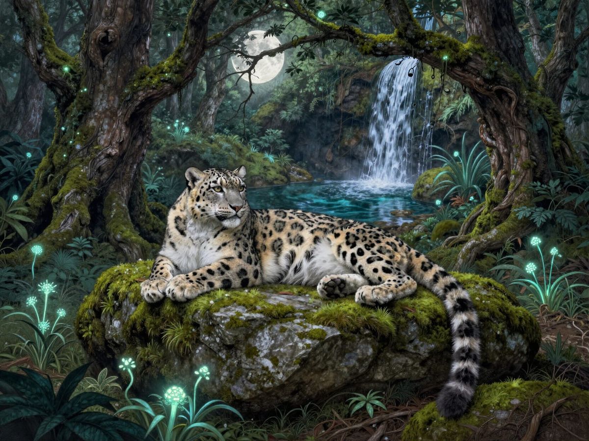 A serene snow leopard rests in an enchanted forest clearing bathed in moonlight and the glow of bioluminescent plants. Detailed illustration style.