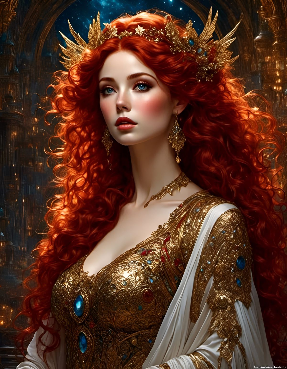 A digital painting of a red-haired goddess, the first of the last, in a detailed tunic. The portrait features soft, dramatic lighting and a hyperrealistic, intricately detailed background in an ethereal style.