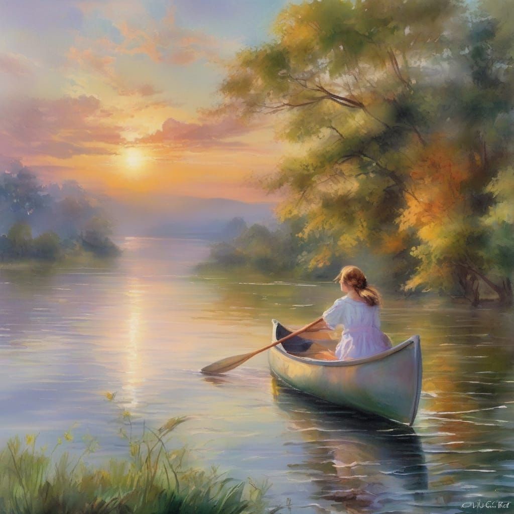 This image shows a serene watercolor painting of a young couple in a canoe, surrounded by lush greenery and vibrant colors, reminiscent of Impressionist masterpieces like Claude Monet's soft brushstrokes and blended hues.
