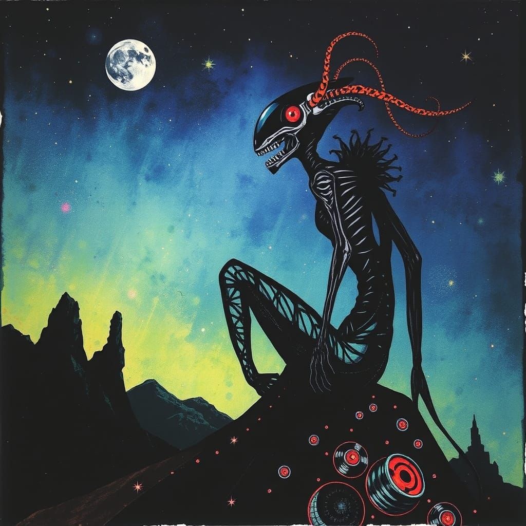This striking image depicts an astral alien woman in a surreal arena setting, inspired by the dreamlike quality of Ben Templesmith and Joan Mirรณ's works, and featuring a unique blend of ink on silk and holographic elements.