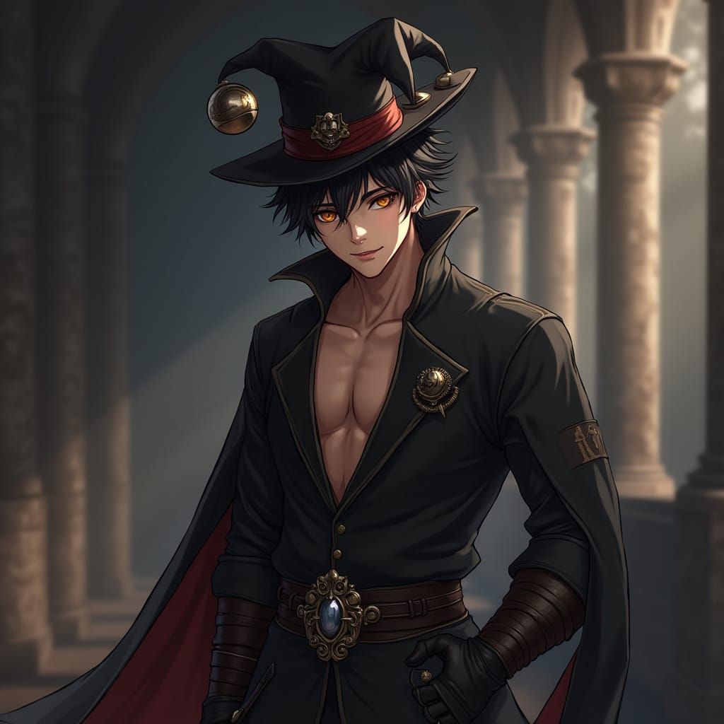 This 3D anime-style image features a confident young clown with mesmerizing golden eyes, set in a medieval atmosphere with subtle lighting, blending realism and anime aesthetic in exquisite detail.