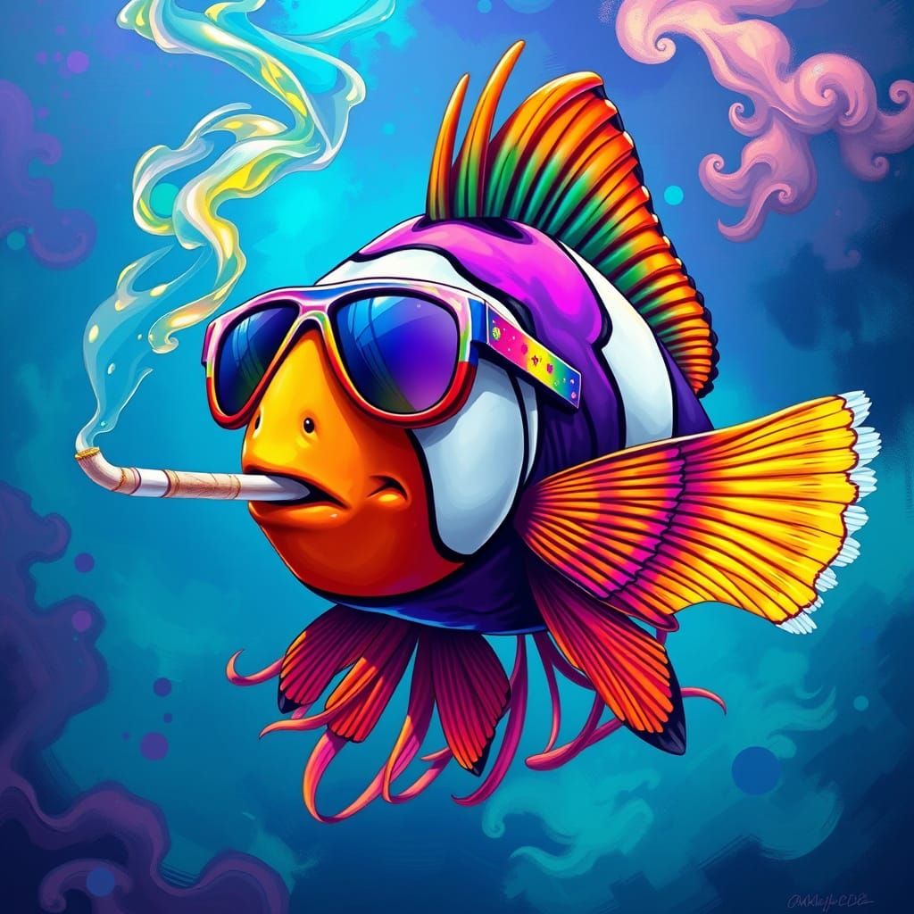 This image shows a cartoon clownfish with hippie attire, sunglasses, and cigarette, underwater. The art style is reminiscent of vibrant, fantastical caricatures with deep, complementary colors.