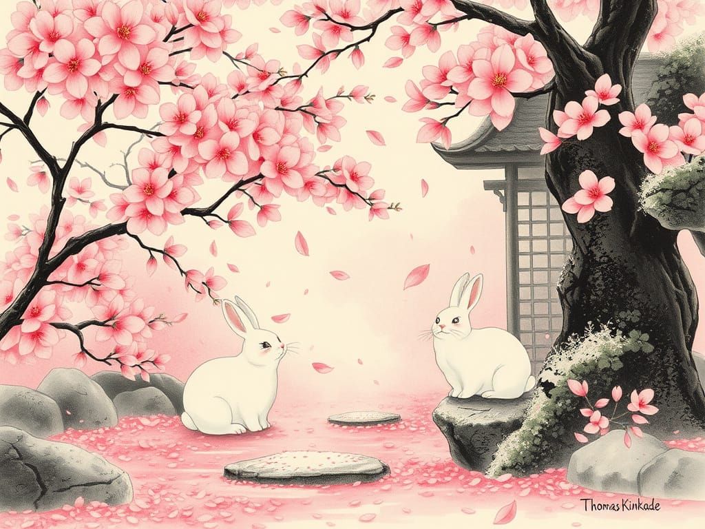 This image depicts a serene Japanese garden scene with delicate pink sakura blossoms and bunnies amidst traditional ink woodblock prints, evoking an ethereal fantasy atmosphere.