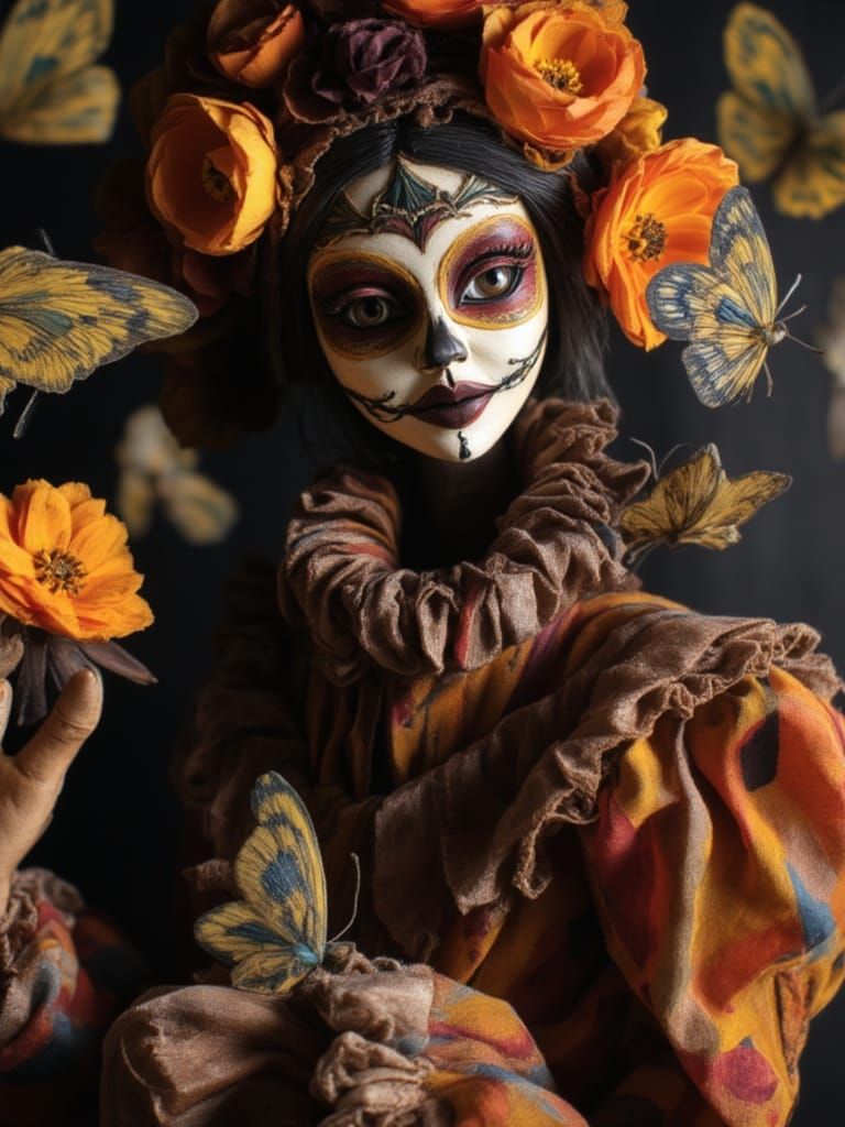This image depicts a woman in vibrant Dia de Los Muertos makeup, decorated with flowers and intricate patterns. She is surrounded by swirling butterflies in a dreamy, soft-focus fantasy setting inspired by autochrome photography.