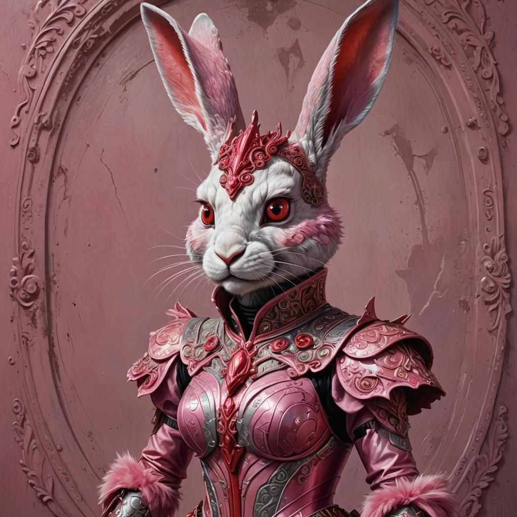 A hyperrealistic portrait of an anthropomorphic rabbit supervillain. The pink-furred humanoid has a human face, red eyes, and wears an ornate costume. This digital art features deep color and intricate detail.