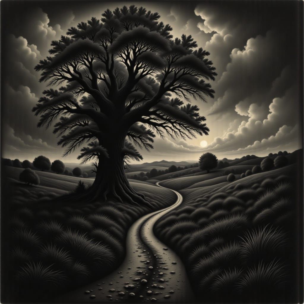 This image displays a desolate, windswept moor beneath a stormy sky. Rendered with deep shadows and stark highlights in a rough, scratched mezzotint style, it evokes ancient mystery and isolation.