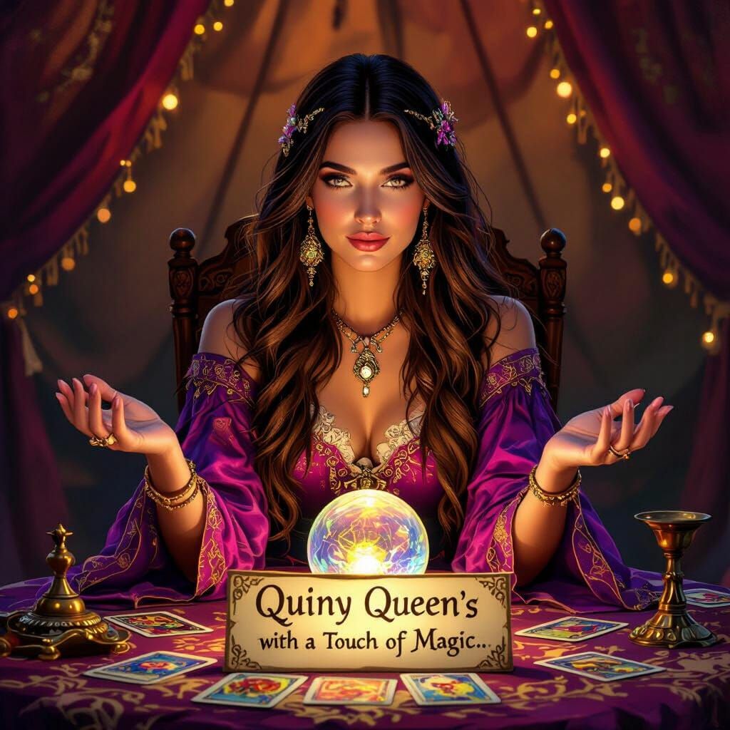This image features a beautiful gypsy woman in a glowing purple and pink dress, seated with tarot cards and a crystal ball. The scene evokes a gallant, enchanting atmosphere with rich textures and warm, deep colors, rendered in an opulent, fantastical art style.
