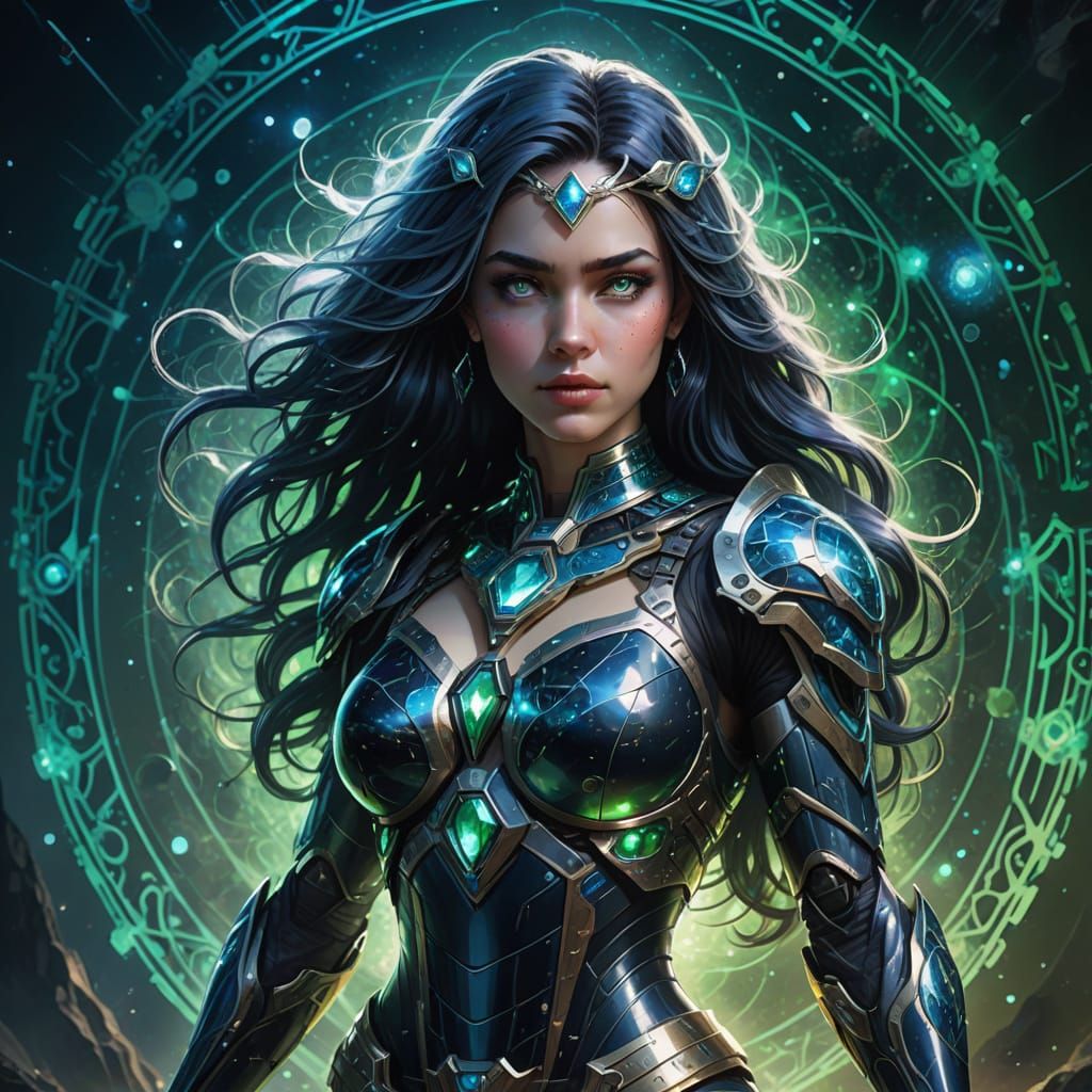 This image shows a beautiful woman with white skin, long blue hair, and green eyes wearing a gemstone necklace containing a cosmos. The woman is in action, wearing ornate black battle armor in a cinematic and ethereal style.