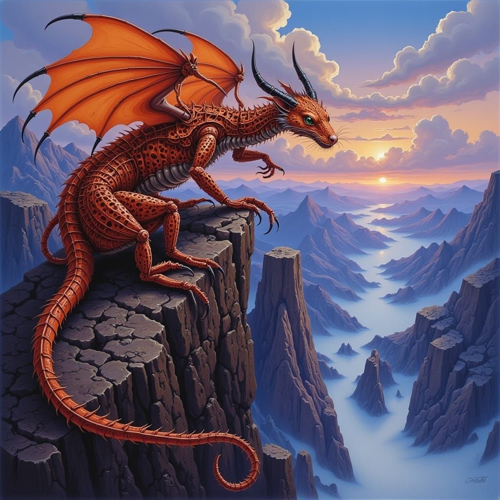 This image shows a lone dragon on a jagged mountain, overlooking a misty valley. It features vivid colors, detailed scales, and dramatic lighting in a fantasy art style.
