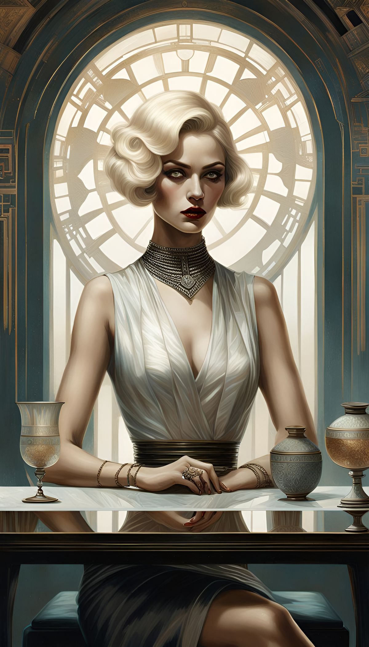 This image shows a blonde woman at a table in a dystopian 1920s scene. The art deco painting features neo-impressionist and expressionist elements with thick, colorful textured paint.