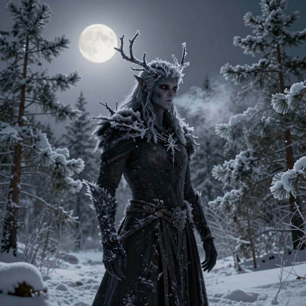This image features a dark, humanoid figure with branch-like hair, standing in a snowy pine forest under pale moonlight. The scene is rendered with photorealistic detail, cinematic lighting, and a desaturated palette with a warm accent.