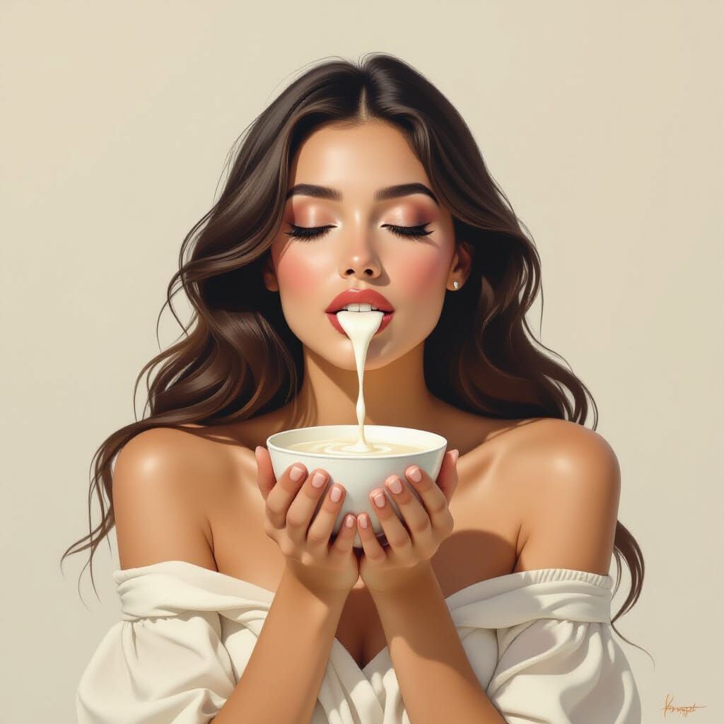 This surrealist oil painting captures a serene woman with milk flowing from her mouth. Rendered with diffused lighting and pastel colors, it evokes otherworldly nourishment.