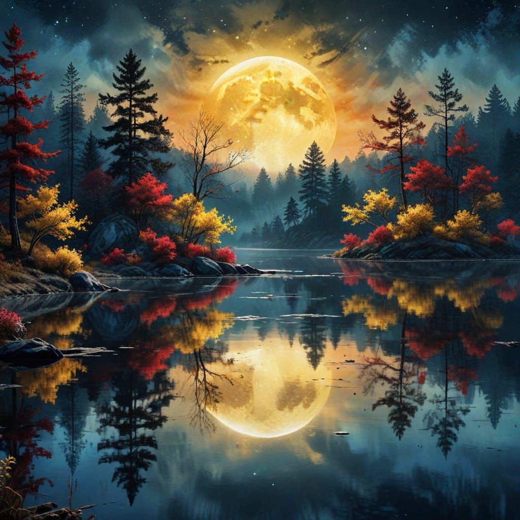 This enchanting image shows a majestic, luminous yellow full moon shining over a tranquil, mirror-like lake at night, with soft, feathery brushstrokes in the trees and mist, and warm, golden light casting a serene ambiance.