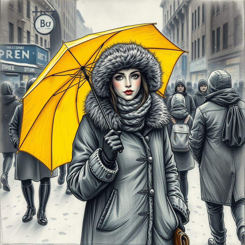 A charcoal drawing of a woman with a yellow umbrella on a busy, snow-covered street. The scene is rendered with hyperdetailed textures and subtle shading, in a graphic novel art style.