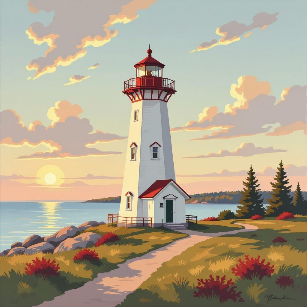 A serene image of the Jackson's Point lighthouse nestled in a rural Ontario landscape. This artwork evokes a pastel-colored, soft-lit scene reminiscent of Canadian landscape paintings.