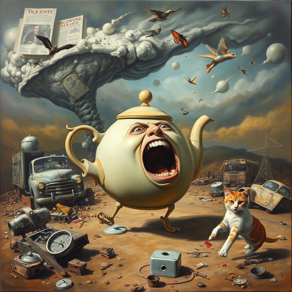 This image shows a surreal scene of a terrified teapot with a human face fleeing a junkyard tornado filled with scrap metal and a cat, rendered as a matte oil painting.