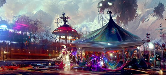 A mesmerizing holographic carousel rendered as mixed media astral art. This image evokes a sinister ethereal fantasy with hyperdetailed elements in a baroque dystopian style.