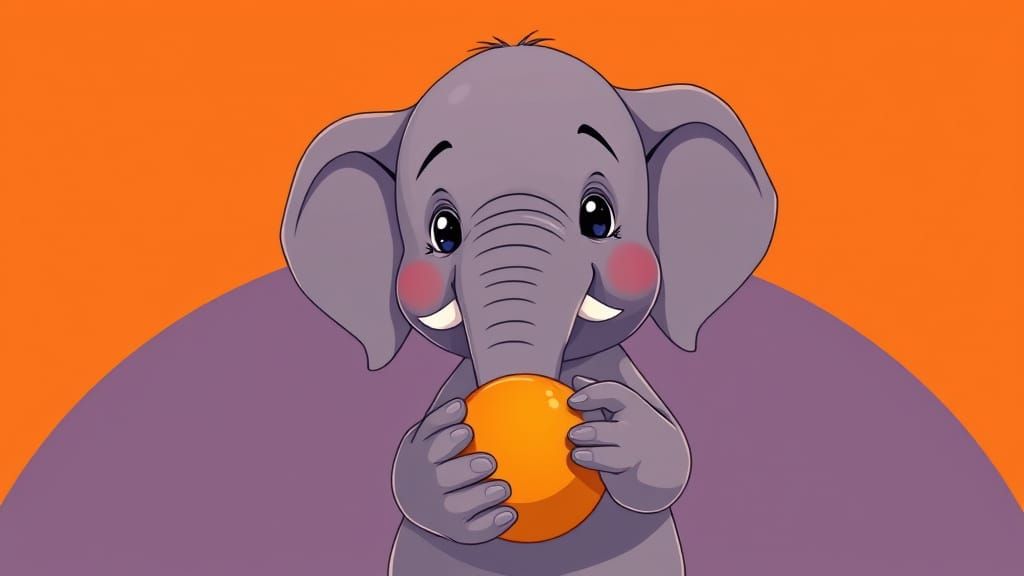 This image shows an elephant holding a vibrant orange. It is rendered in a flat, cel-shaded anime style with deep colors and cinematic lighting.