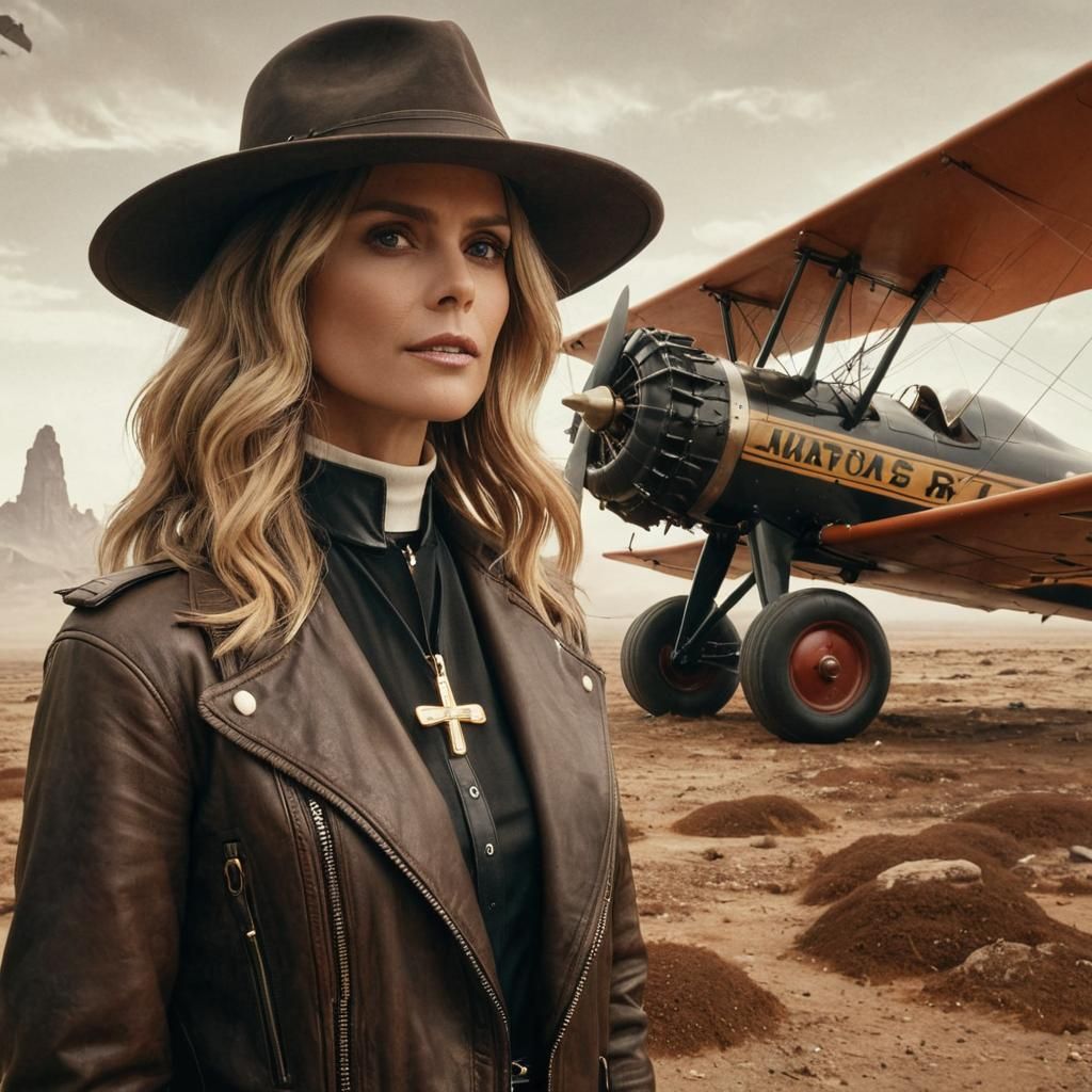 This image shows a person in a cleric's collar, fedora, and leather bomber jacket standing before a Steerman biplane on an alien world. The image has a cinematic quality.