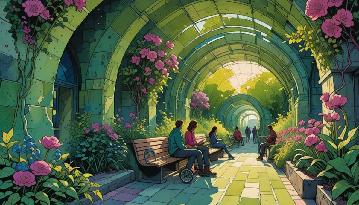 This image shows a futuristic arcology with people on benches and bicycles. Rendered in a comic book style, the scene features Moebius-inspired lines, watercolor textures, and vibrant colors in a cheerful atmosphere.