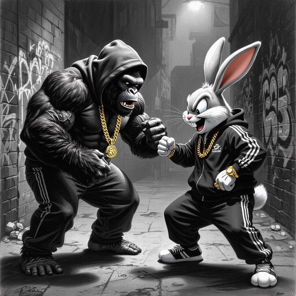 Generate your own unique gangster ape and bugs bunny scenes with our easy-to-use AI image generator. Free and fast!