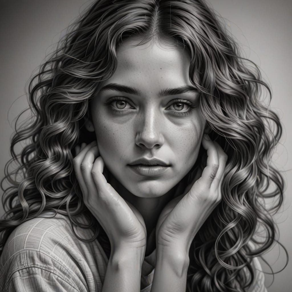 This image showcases a finely detailed, black and white pencil sketch of a beautiful woman with a serene expression, resting her face on her hand, surrounded by softly shaded textures and gentle curves.