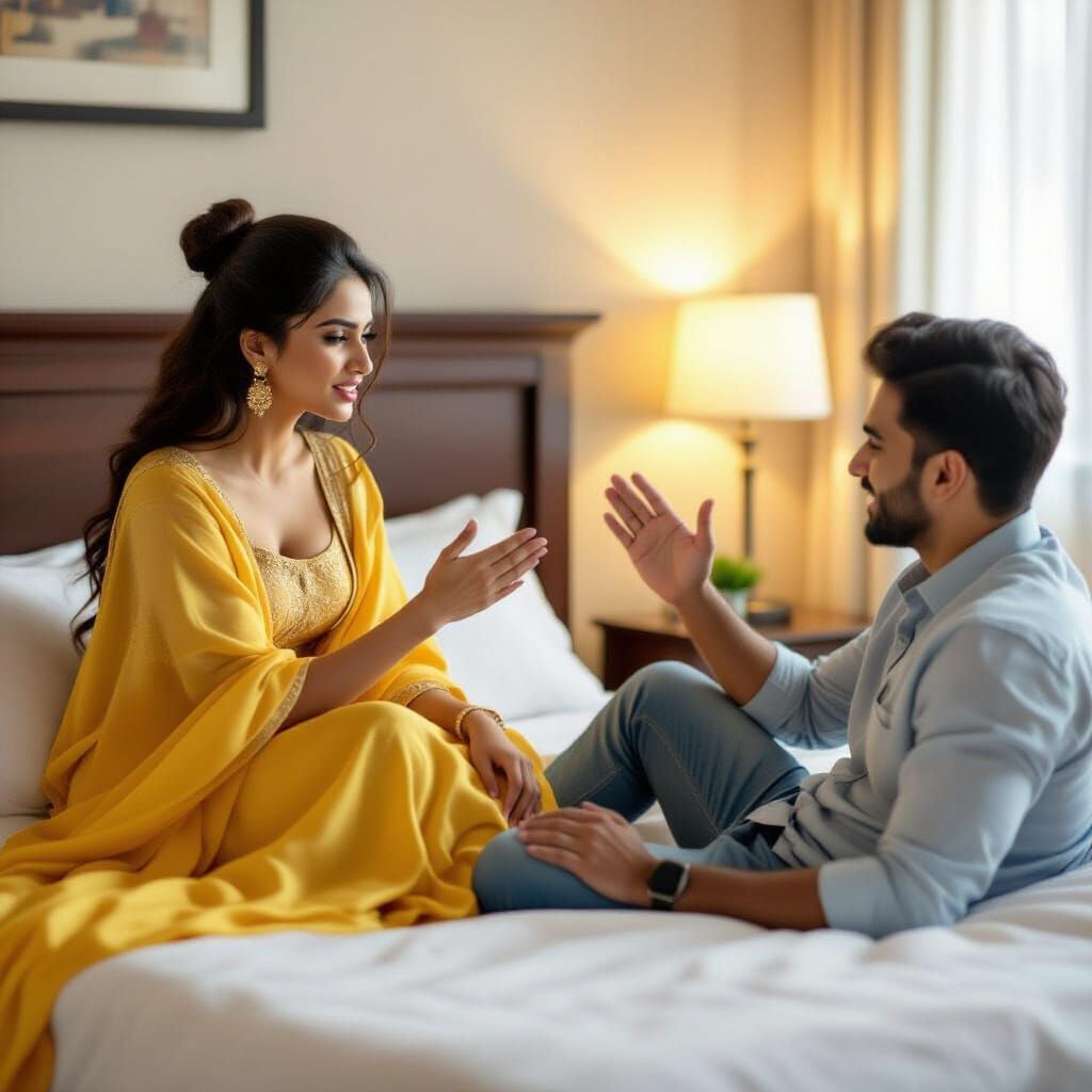 This image depicts an Indian woman in a yellow silky outfit sitting on a bed, confronting a man. Her hair is in a bun, and she has a serious expression as she prepares to slap his outstretched hand in a moment of admonishment.