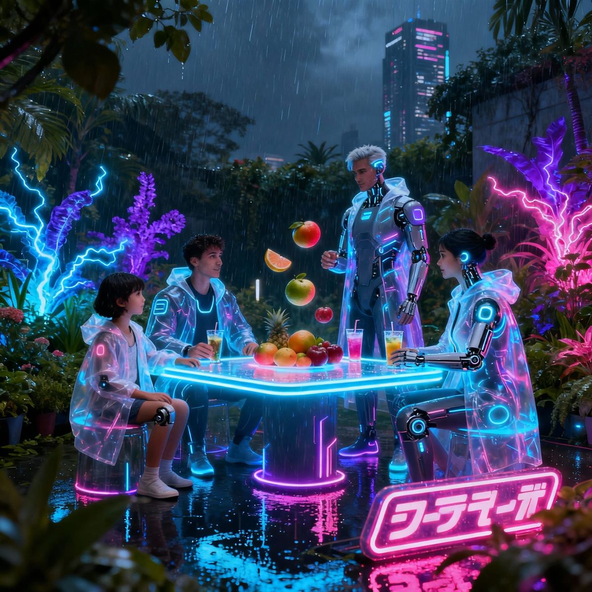 This image depicts a futuristic family enjoying a garden party in a cyberpunk setting. Neon lights create vibrant reflections on wet surfaces, with a moody, high-contrast atmosphere.