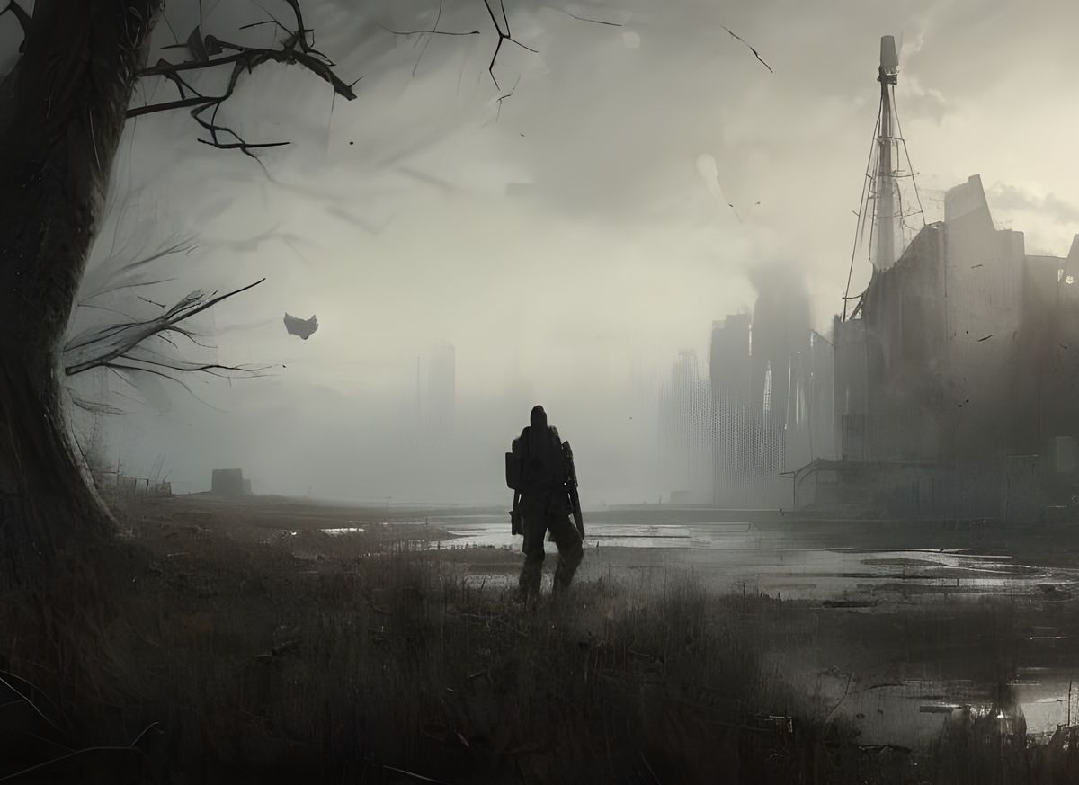 A landscape in 4K resolution inspired by Escape from Tarkov. The image has a dark, ominous mood with a digital painting style.