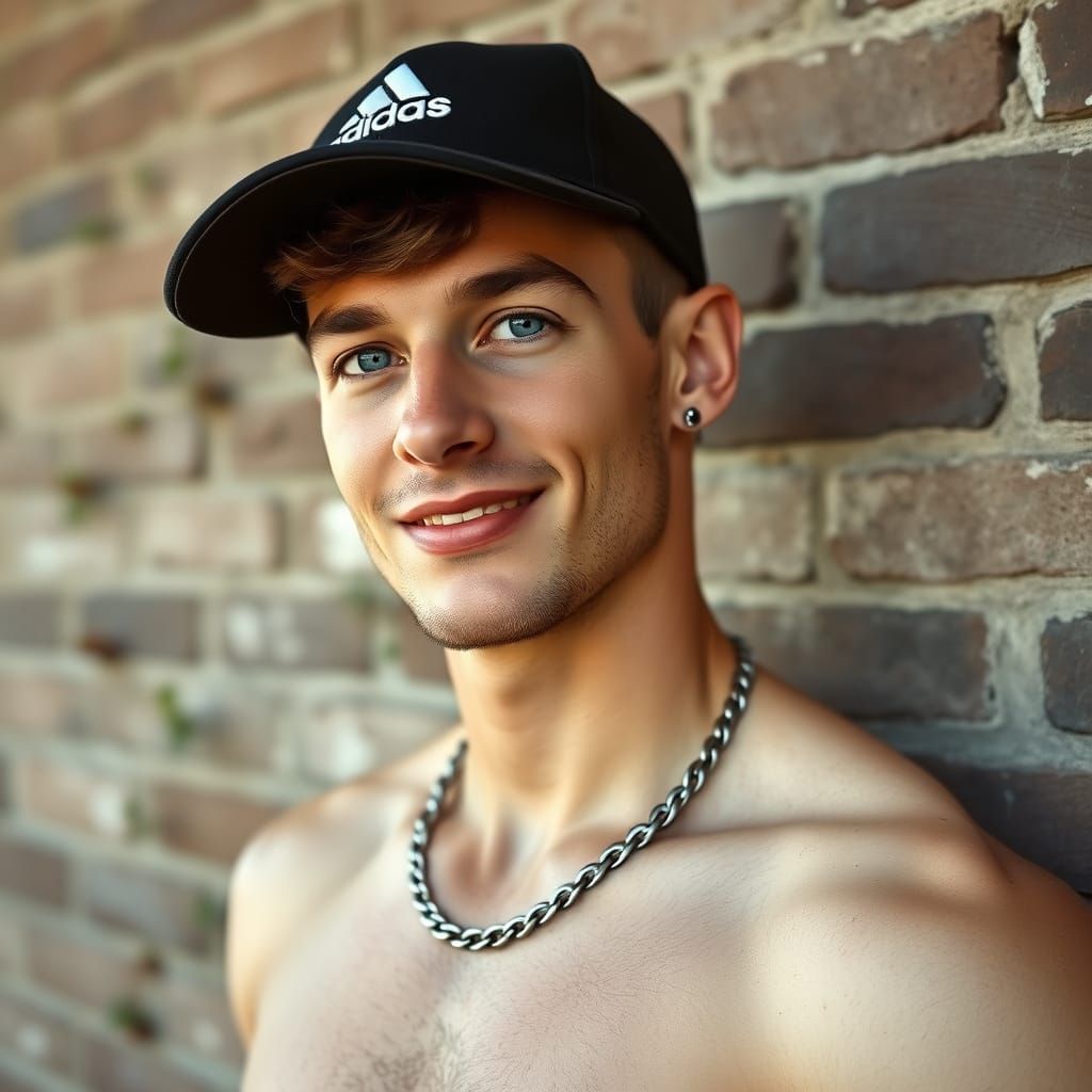 A striking black and white portrait of a man leaning against a brick wall. The photograph is reminiscent of analog photography, with strong contrasts and soft film grain.