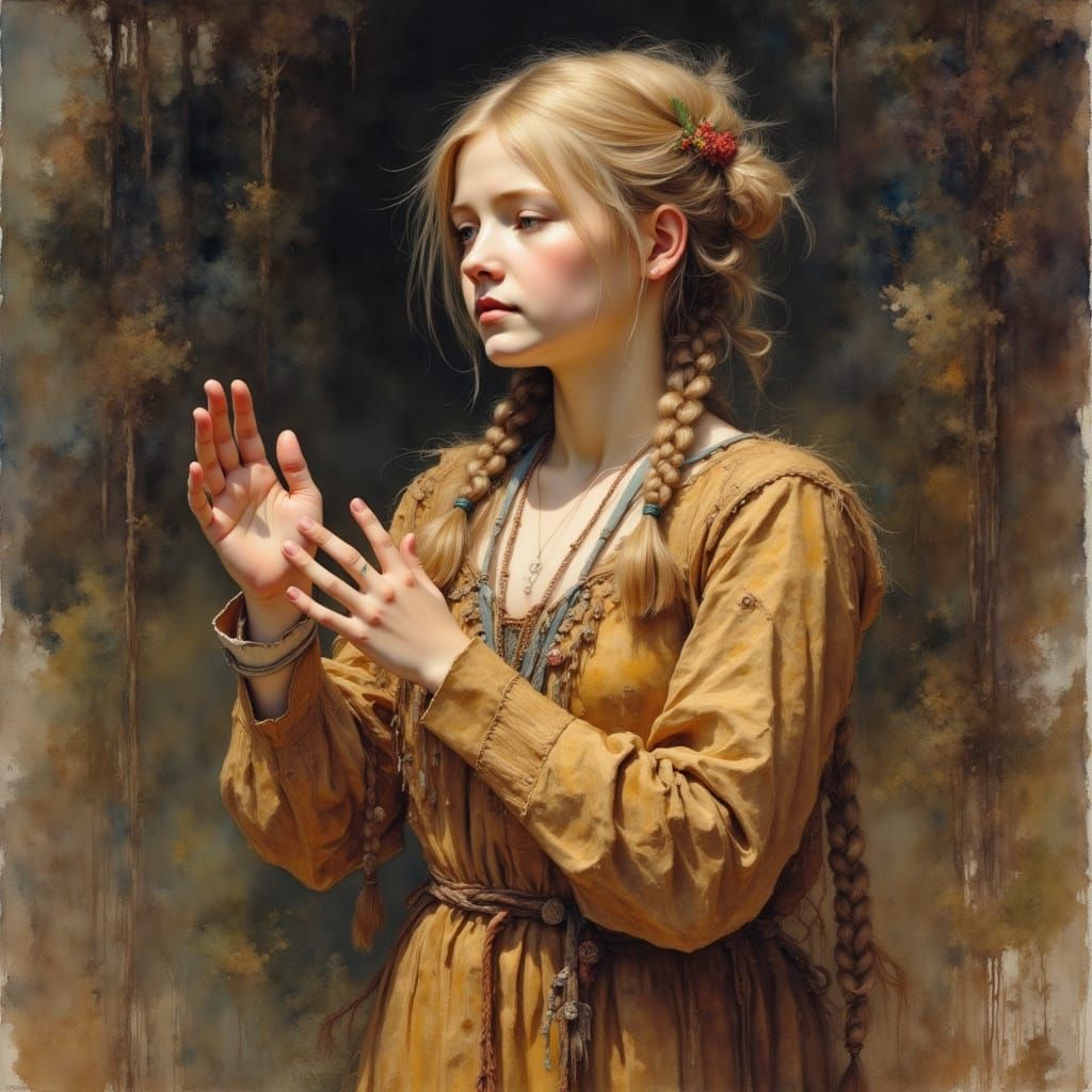 This image depicts a 19-year-old woman in a fringed elk hide Native American dress, with hands extended in supplication. Rendered in a romantic realist style with soft, dramatic lighting.