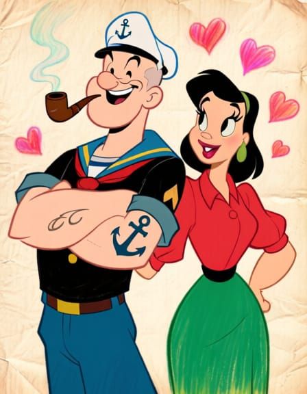 This image shows Popeye embracing Olive Oyl amidst floating hearts. Rendered with vibrant colors and sketched lines, the artwork evokes a blend of whimsical cartoon styles on textured paper.
