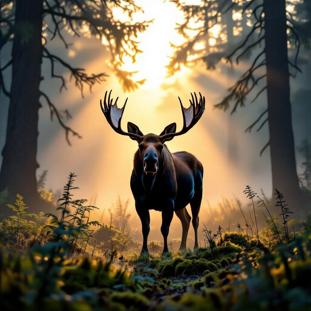 This image captures a bull moose in a sunlit, misty forest at dawn. Rendered in a hyperrealistic, painterly style, it features dramatic lighting and an earthy palette, evoking a serene, awe-inspiring mood.