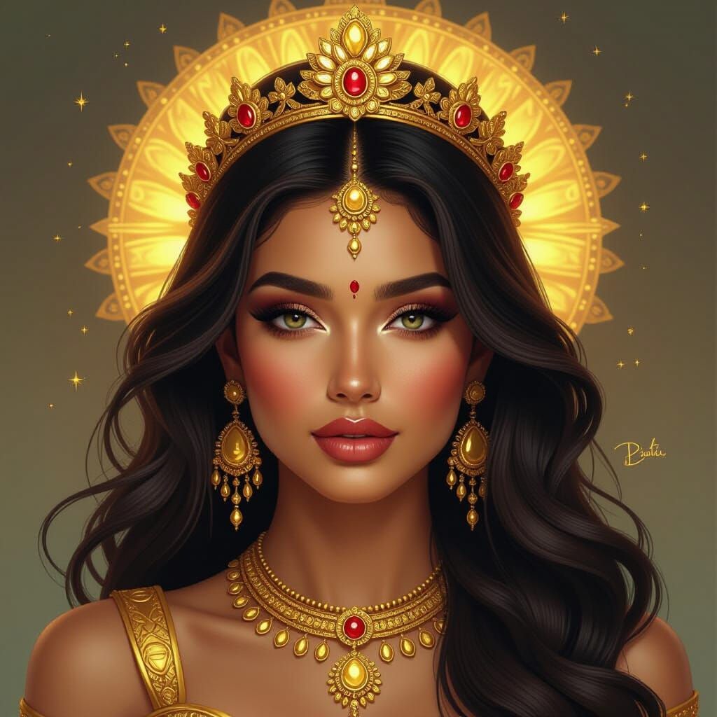 This image shows a hyperrealistic digital portrait of a golden goddess. The artwork exhibits rich details and a painterly style, reminiscent of oil paintings.