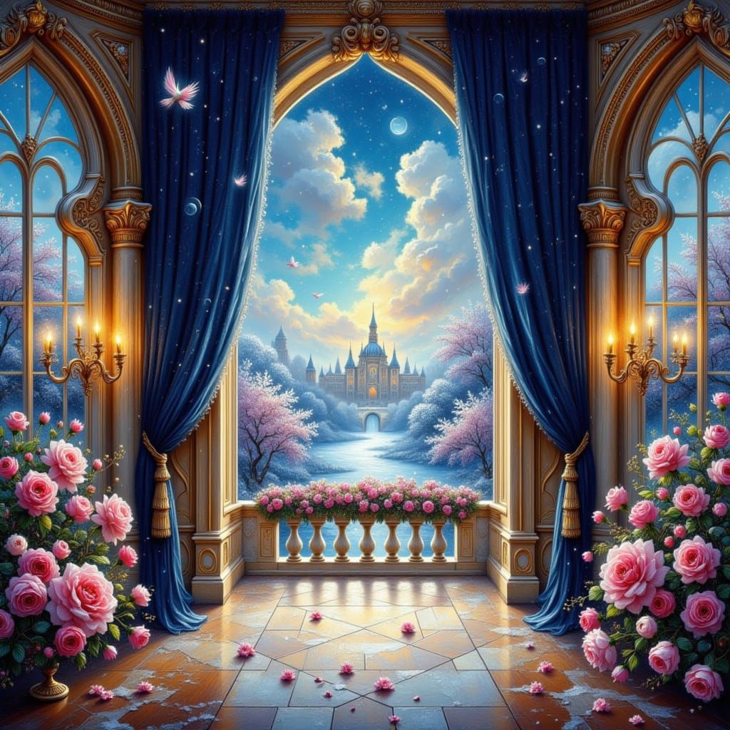This image shows a grand, empty ballroom with gilded arches and velvet curtains, opening onto a balcony overlooking a winter garden. The scene features soft golden light and a magical, peaceful atmosphere.