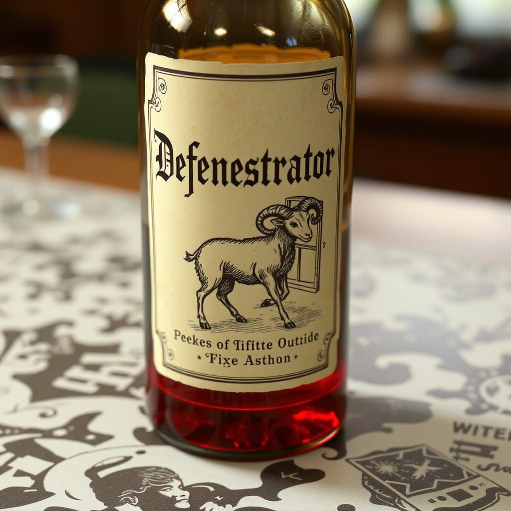 A fantastical image of a potion bottle with a pixie woman trapped inside, surrounded by classic lettering and a drawing of a ram breaking a window, set against a subtle background.