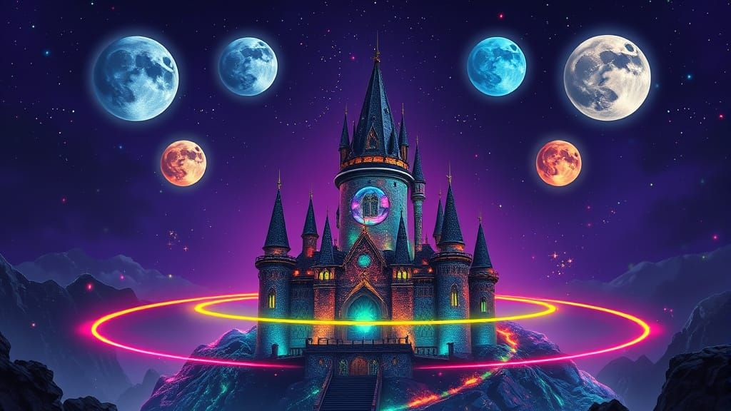 This hyperrealistic digital painting depicts a black opal castle encircled by rainbow fire. A deep purple night sky features five colorful moons and numerous glowing fireflies, creating a magical atmosphere with cinematic lighting.