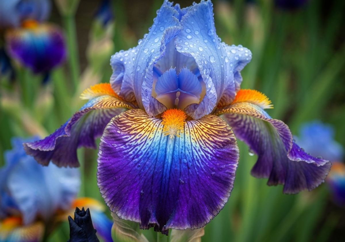 This image shows a hyper-realistic close-up of a majestic bearded iris in full bloom. Featuring deep blues, violets, and golden veining, with dew drops and soft bokeh background.
