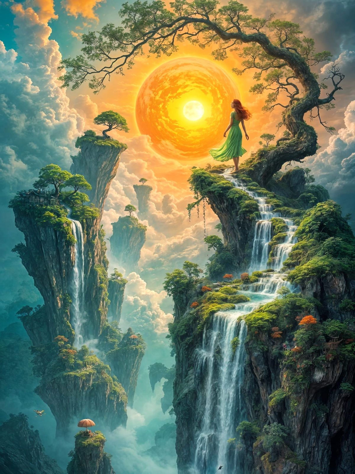 This image depicts a dreamlike scene with floating mountain islands, lush flora, and thriving wildlife, set against a vibrant, cracked cloudscape with a winding path and a red-haired woman in a light-green dress.