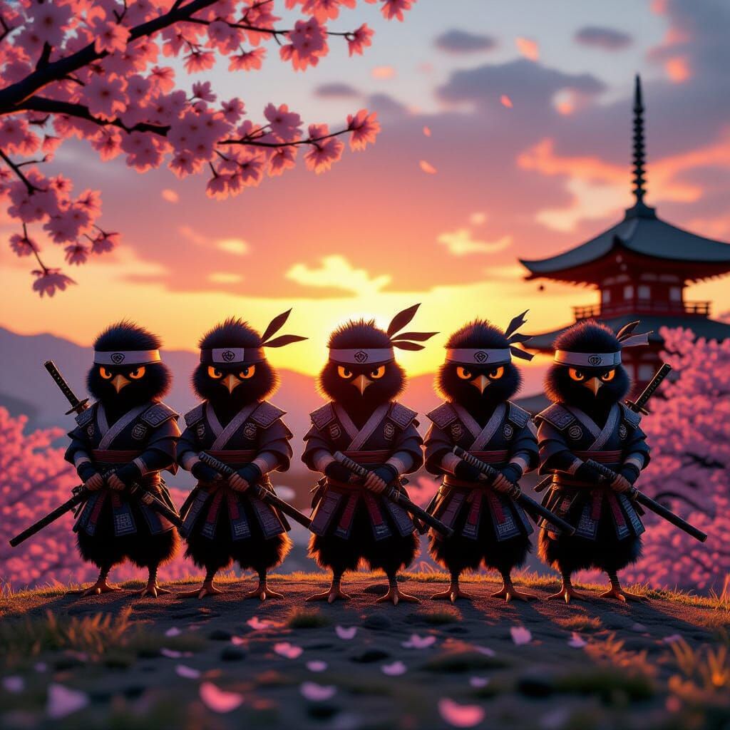 A striking picture of five ninja chicks on a hill in Japan at sunset. They are armed and wearing headbands, with cherry blossom trees and a temple in the background. The image is highly detailed with a shallow depth of field.