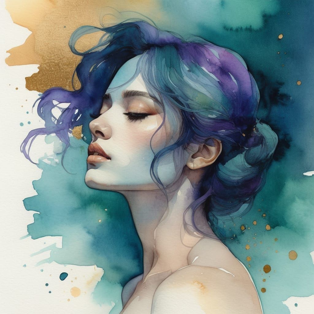 A watercolor painting of ethereal female figures in elegant poses. This close-up portrait features soft watercolor washes of blues and purples, with vivid color splashes in a dreamy, sensual style.