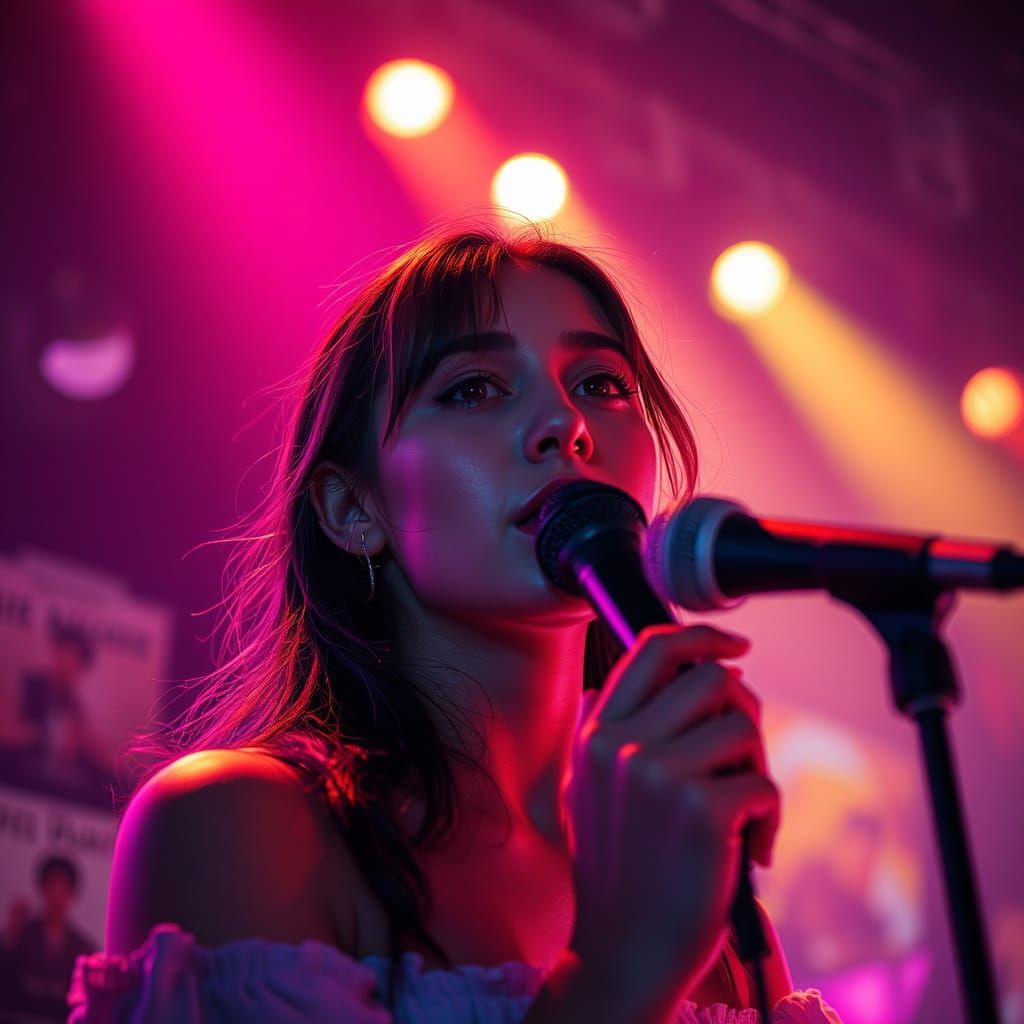 A softly lit stage scene featuring a woman singing into a microphone. Starry night sky and music posters create a hyperrealistic concert atmosphere. The image is reminiscent of atmospheric digital art.