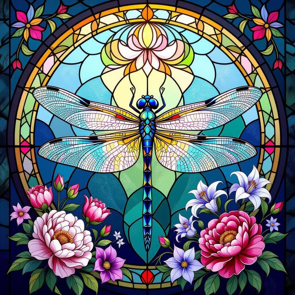 A detailed stained glass illustration of a dragonfly with iridescent wings, set against a floral window and lush flowers. The art features luminous, translucent glass segments.