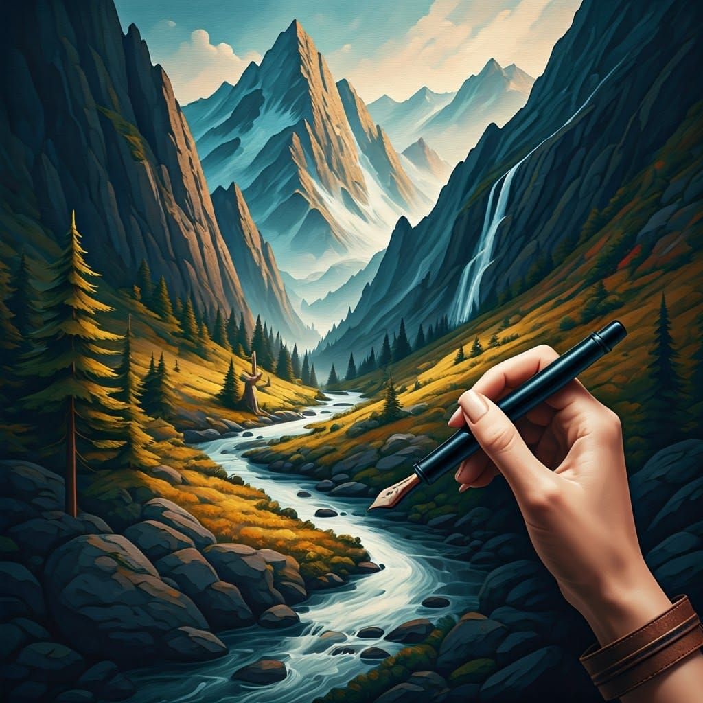 A picture showing a hand with a fountain pen drawing a mountain landscape with a waterfall. The artwork is gouache on canvas, with heavy brushstrokes and impasto textures.