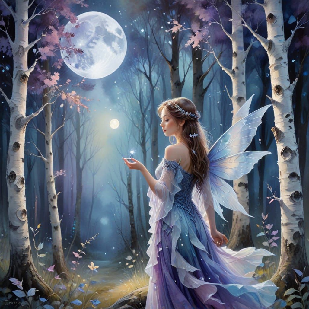 This captivating watercolor painting depicts a fairy standing in a serene birch forest bathed in the soft, ethereal light of a full moon. Delicate brushstrokes and gentle textures evoke a dreamy, whimsical atmosphere, while the fairy's luminescent glow and the misty surroundings create a sense of mystiqu...