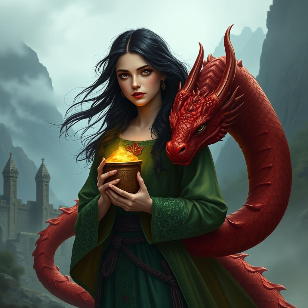 This image shows a dark-haired woman in a green medieval dress holding a glowing grail, encircled by a protective red dragon. Misty mountains and ruins form the backdrop, rendered with high detail in a cinematic fantasy style.
