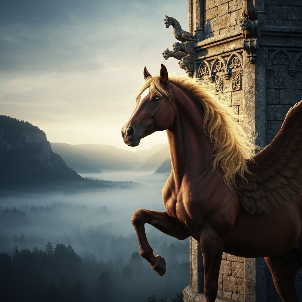 A captivating image of a pegasus atop a weathered tower amidst a misty valley. The scene is rendered in a dark fantasy style with gold and bronze highlights, creating ethereal beauty.