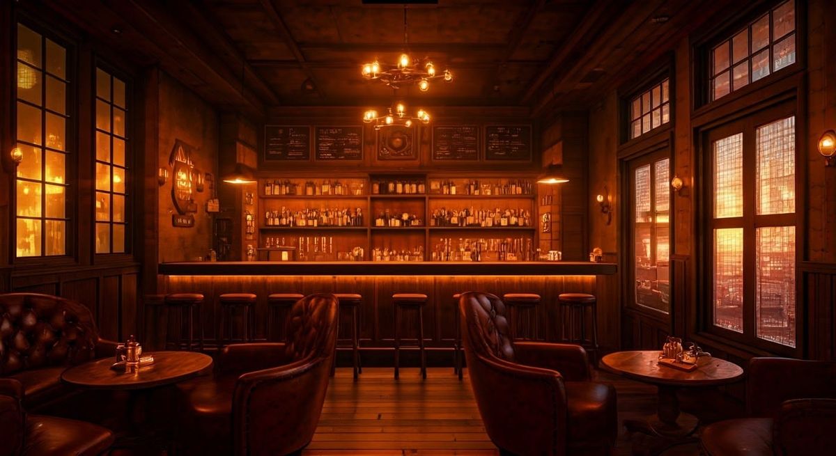 This inviting coffee shop is set in warm, golden lighting, with rich dark wood accents and plush leather armchairs, evoking a nostalgic, classic American atmosphere, reminiscent of vintage metal signs and delicate latte art.